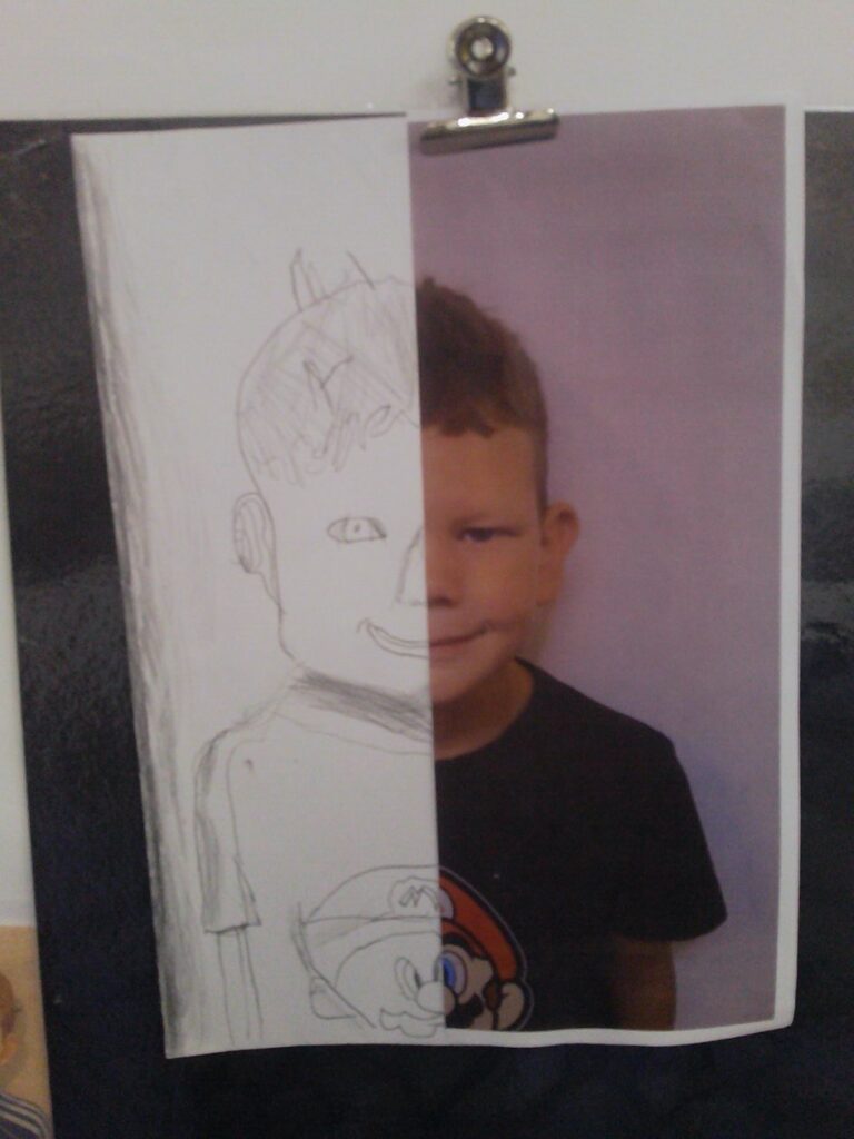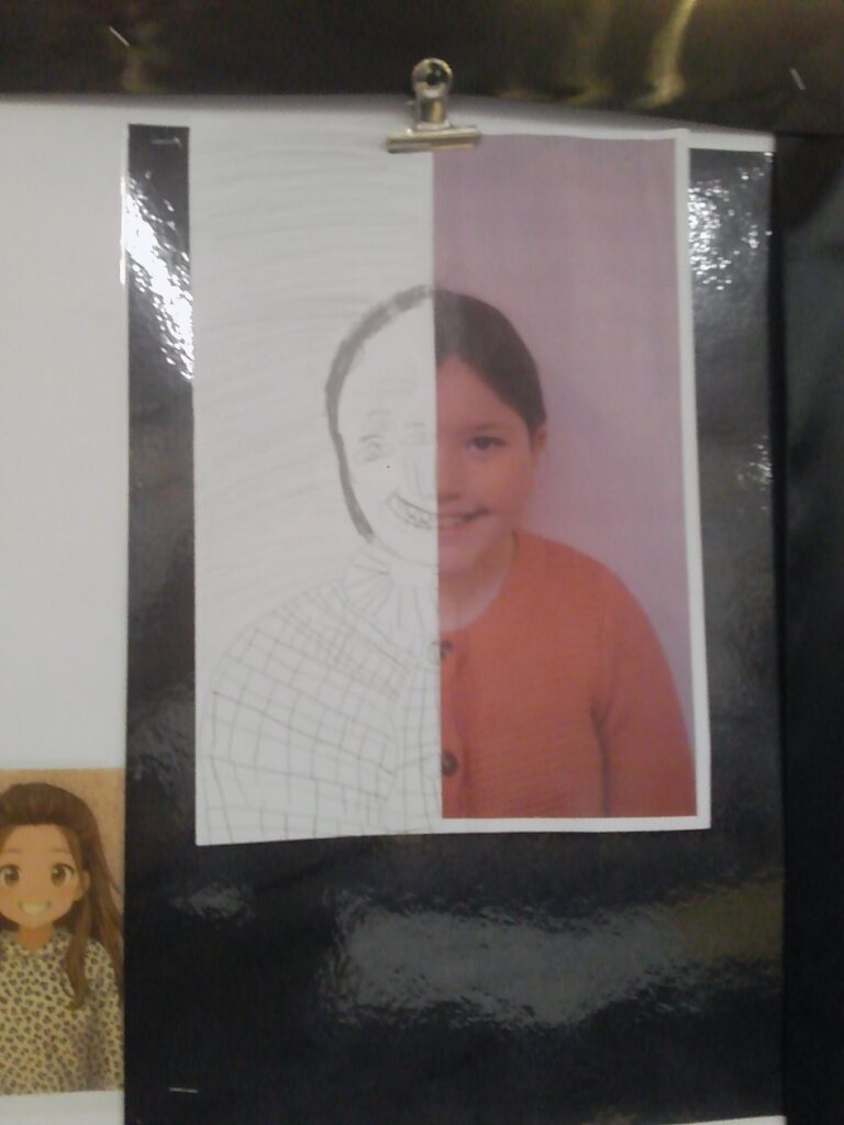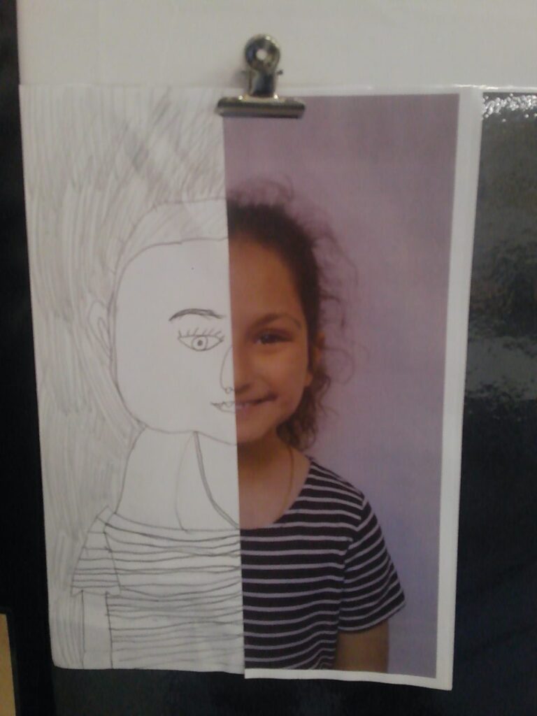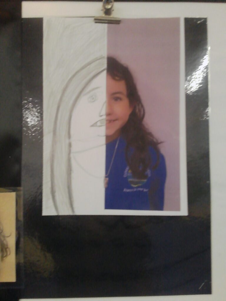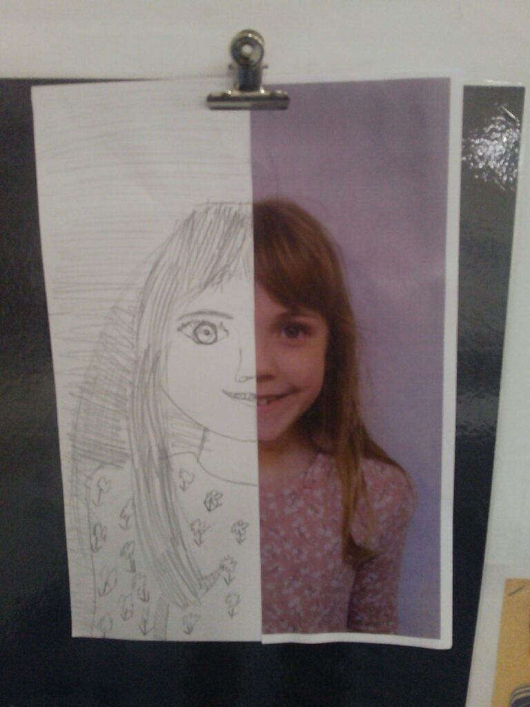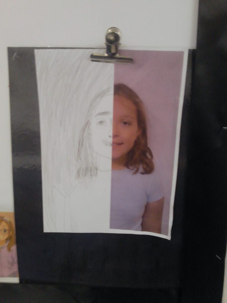 The children we given a photograph of half of their face. They then drew and shaded the other half in pencil.