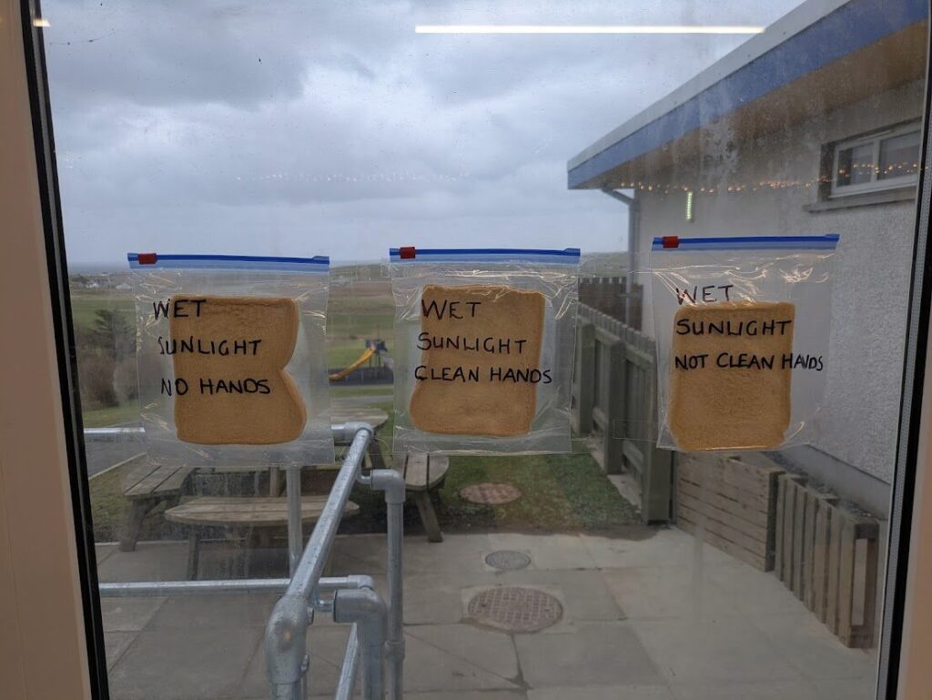 Our science focus for this week was on micro-organisms. We are trying to grow our own mould but we are testing out whether mould grows faster in the light or the dark and also testing whether mould grows faster on bread that has been touched by no hands, clean hands or unwashed hands. It will be interesting to see how this experiment develops.