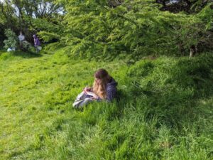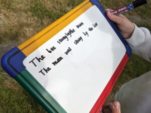 We have been outside as much as possible during health week. Today we were working on literacy, creating active/passive sentences in the wildlife area.