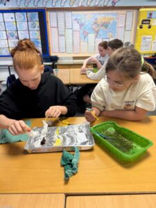 The morning was spent talking about the Braer disaster and how oil spills are cleaned up.  Pupils were given a variety of materials to use to clean up an oil spill (oil and cocoa powder!).  Some of the creations were more successful than others but all managed to clean up some of the oil.