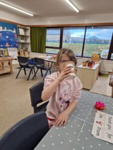 We loved being in the nurture room with Aimee this week because she brought in supplies for us to make a cup of tea. We got to do it ourselves and then sit and enjoy it together. There was different kinds of milk to choose from like oat, almond and cows milk, or we could choose to have it with no milk. There’s nothing better than a good cup o tae to git da day goin’! By P4