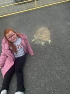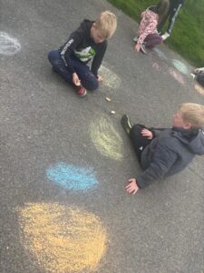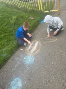 We spent some time outside using chalk to create our solar system. We had to think about and remember learning we had done on the planets – their names and what they look like and the size of them!