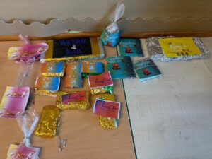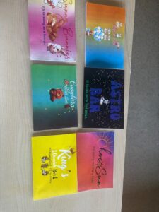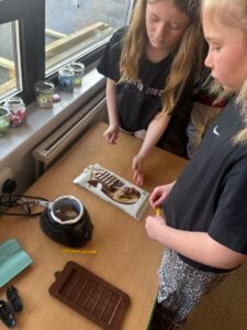 Now that we have finished reading the book, we became Chocolatiers ourselves and created our own chocolate bars! We came up with a recipe, made the chocolate by melting it down and adding different flavours, colours and sprinkles. We also made a brand name and created a package for our chocolates. Have a look at some photos of this!