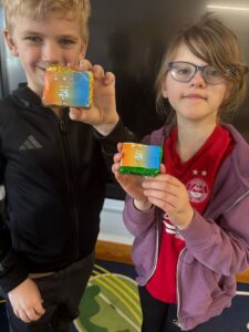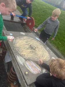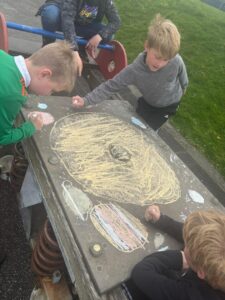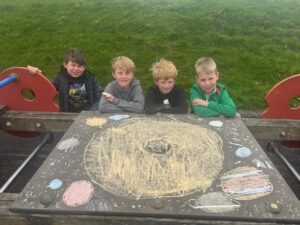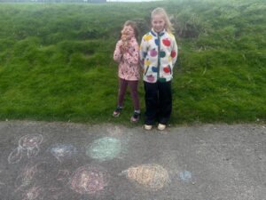 We spent some time outside using chalk to create our solar system. We had to think about and remember learning we had done on the planets – their names and what they look like and the size of them!