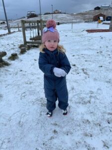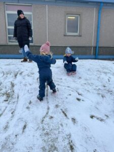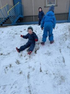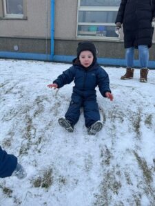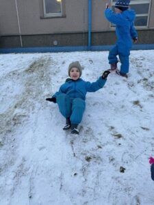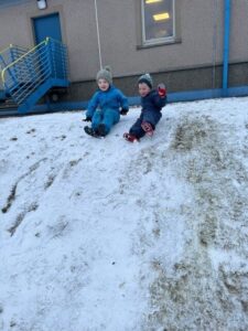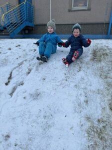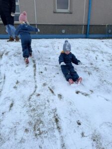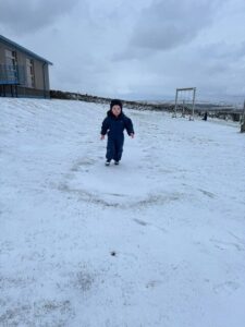 Later, sledging down the peerie hill brought plenty of excitement! Navigating the ‘slidey’ and ‘slippery’ slope required real physical skill, helping the children develop their balance, coordination, and resilience as they worked hard to climb back up for another go.
