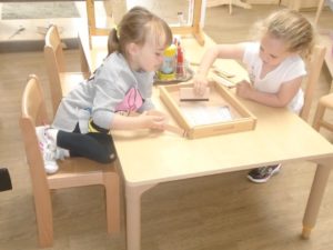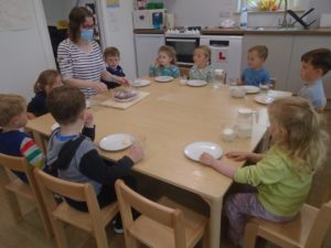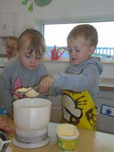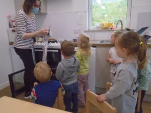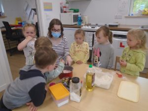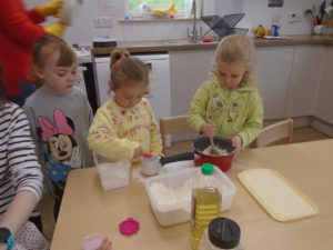 We have also been very interested in making playdough this week and choosing different smells and colours to include. We’ve had mint, orange, vanilla and strawberry playdough this week! Again, making playdough with friends allows us to learn how to follow instructions, measure, count, discuss our ideas, take turns and develop our senses.
