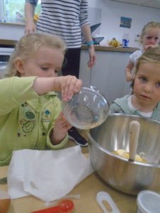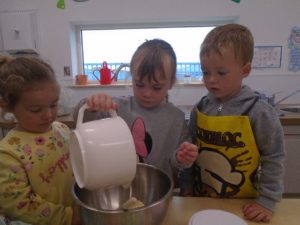 On Monday Alfie and Sophie wanted to bake a cake so Mrs Williamson took in some ingredients on Tuesday and lots of us joined in the baking session. Measuring out the ingredients helps us to recognise numbers, realise that they are meaningful and develops our sense of quantity.