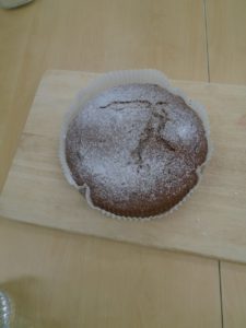 And it was! A lovely round chocolate cake! We counted how many people wanted a small slice and then cut it into pieces. We ate a small slice of cake with some healthy pear slices and discussed what other food is healthy and why fruit is good for us.