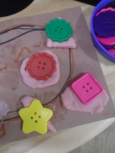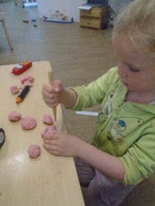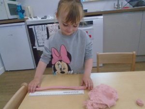 We’ve also rolled playdough into sausages which is one of the ways we develop hand eye co-ordination and gross and fine motor control. Discussing our sausages, and comparing them, develops our communication skills such as listening and talking and numeracy skills such as awareness of shape and length.