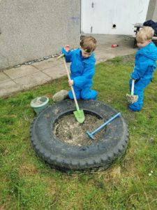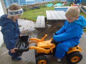Digging holes with Mrs Williamson inspired some of us to continue this into our pretend play. Digging is an excellent way for us to develop shoulder and core stability and strength which we need for future writing and sitting. Ali and Harry used a rake and  big shovels to fill buckets with gravel for their “road”.