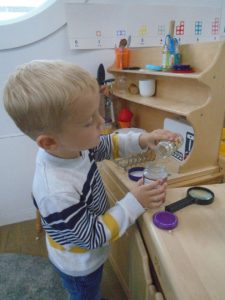 Lewis, Stanley and Jessie-Anne created “soup” and “tea”. Using different shapes and sizes of containers develops our awareness of volume, shape and quantity.
