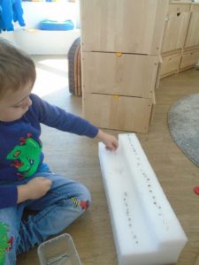 Pushing nails into foam to create “steps” encourages us to use a pincer grip which we need for writing as well as develops finger and hand strength.