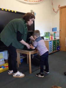 This term they have had fun learning new vocabulary for body parts and clothing. They hung up clothes and played the dressy up bag game, which they loved.