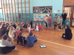 after breaktime the younger children joined us as next years primary 1’s. They all listened to the story of Inch and Grub, which is really funny. It is about two cavemen who are constantly trying to be better than each other.
