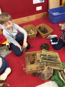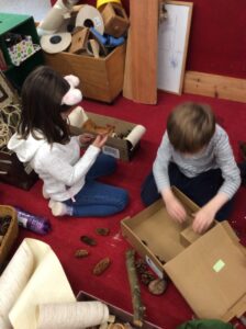 For number 2 the children made little nest models with two eggs made of plasticine, they also had two feathers for tickling each other like the character in the story. They worked with a partner to collect outdoor objects (two of each) and create a picture together.