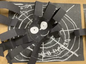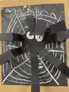 For number 8  the children made spiders with 8 bendy legs and spider webs with 8 ‘spokes’ and 8 flies on their paper collage.