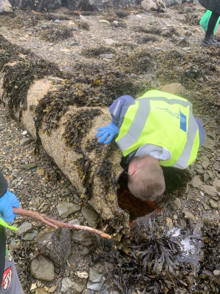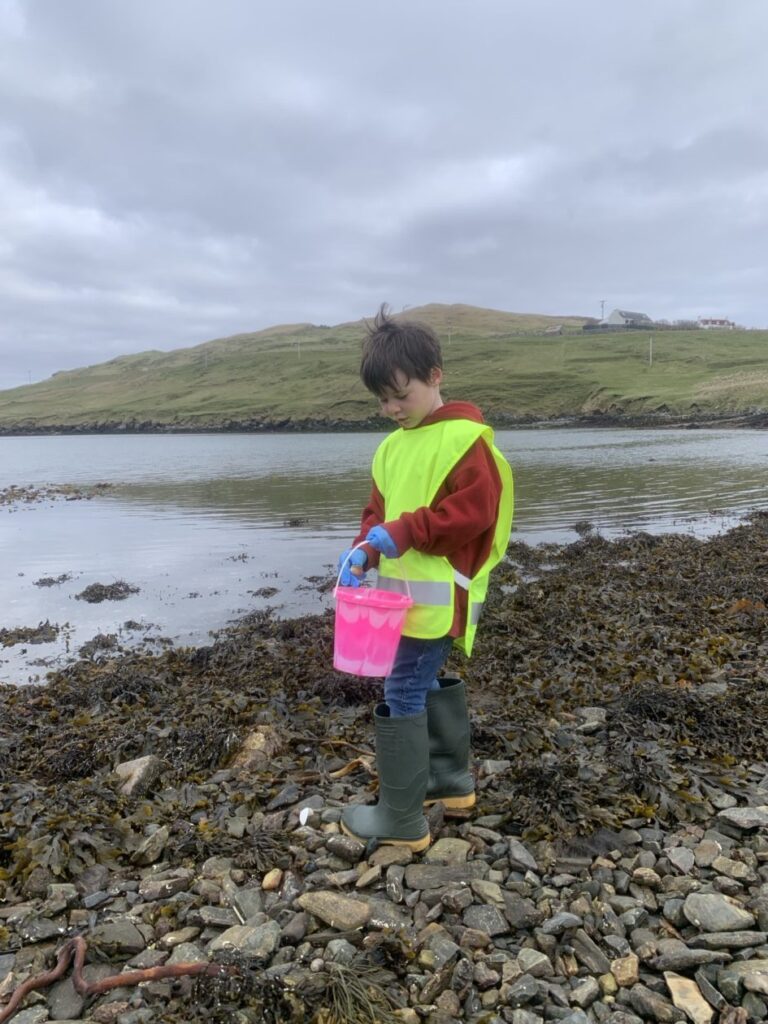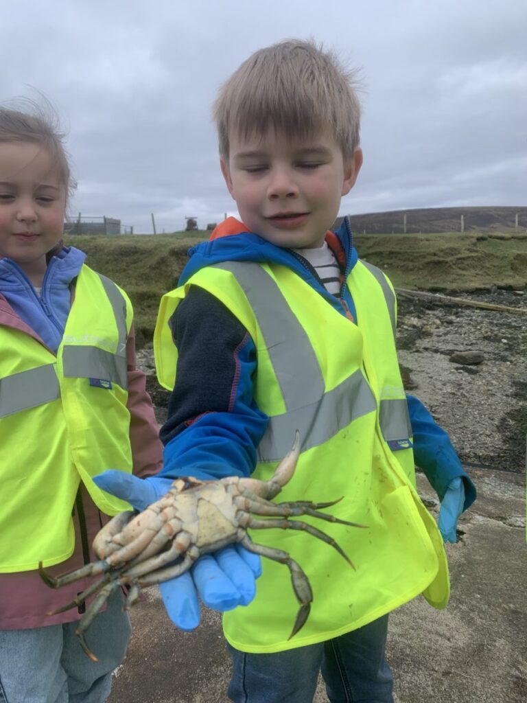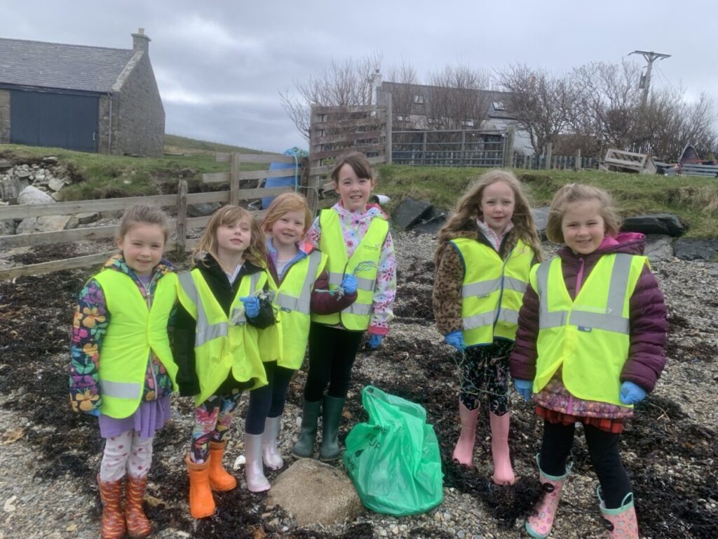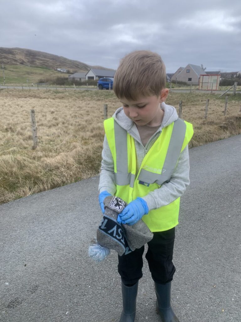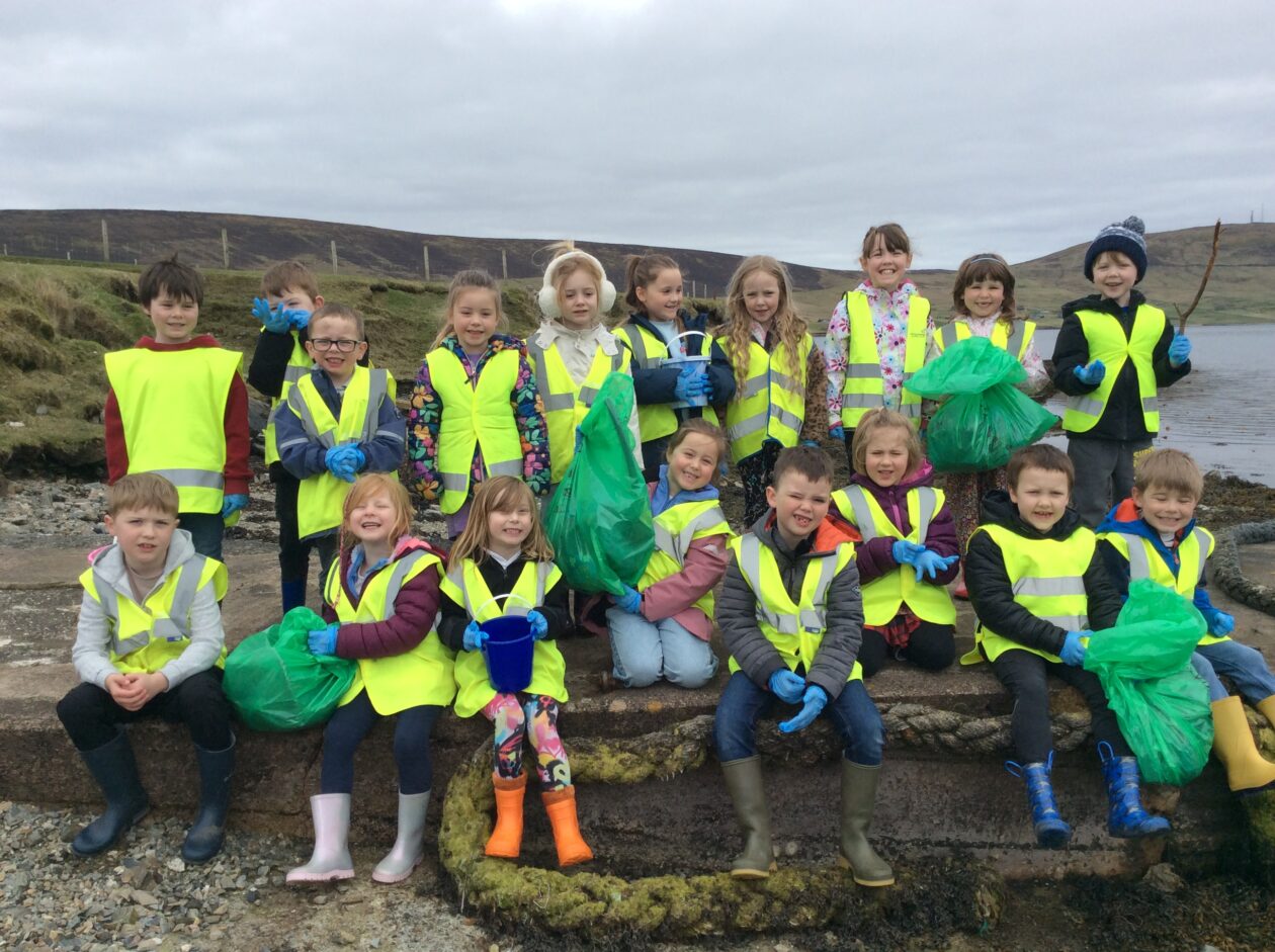 On Friday the tide was low so the bairns went to the Taing beach to take part in the Voar Redd Up. They mostly found bits of rope and plastic but the more unusual finds were a toorie and cans and bottles in the grassy area between the school and the top of the beach road.