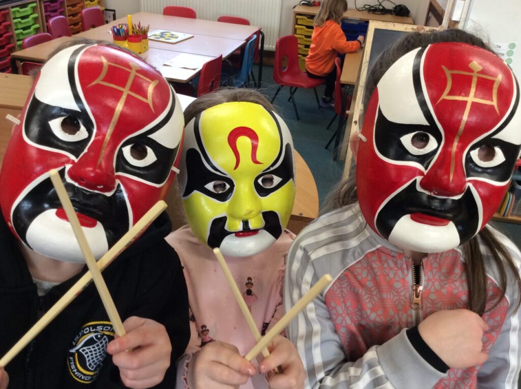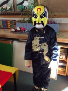 We also had some chinese masks, costumes and other items to investigate and play with in class. Can you guess who are behind these masks?