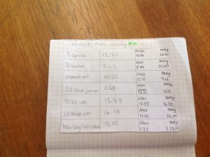 We came back to the classroom and had a look at our tables. We found out who had the fastest time, we compared the difference between the slowest and quickest time and finally we added up our own times for all of the activities.