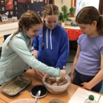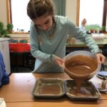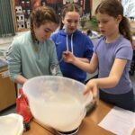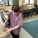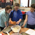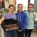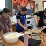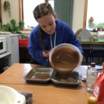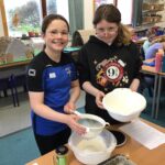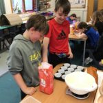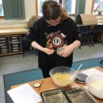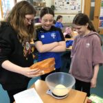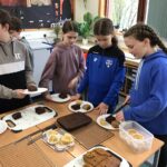 Another group (Saoirse, Livia, Grace) choose to make a chocolate vinegar cake which used a lot of sugar! It used a lot of ingredients so it needed two tins. The batter was quite liquid and the recipe said that it wouldn’t rise that much, although it rose a lot! In the war they used vinegar to react to the bicarb to mimic eggs as they didn’t have enough to go around, especially in cities.