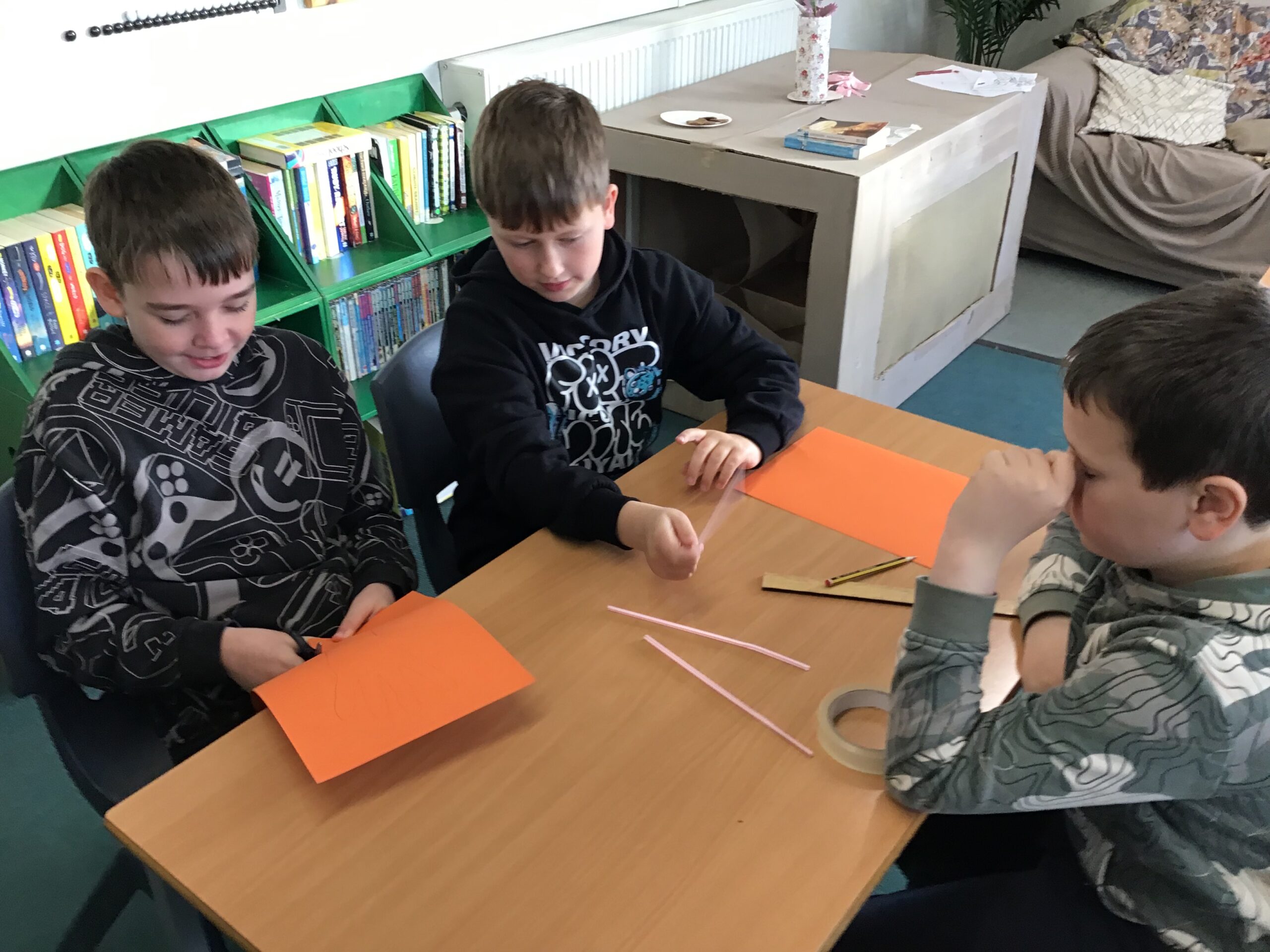 First, we got into groups of 3 and got all of our supplies (card, scissors, sellotape, some straws, string and a ruler.) Then we figured out who had the biggest hand and drew the outline onto the paper.