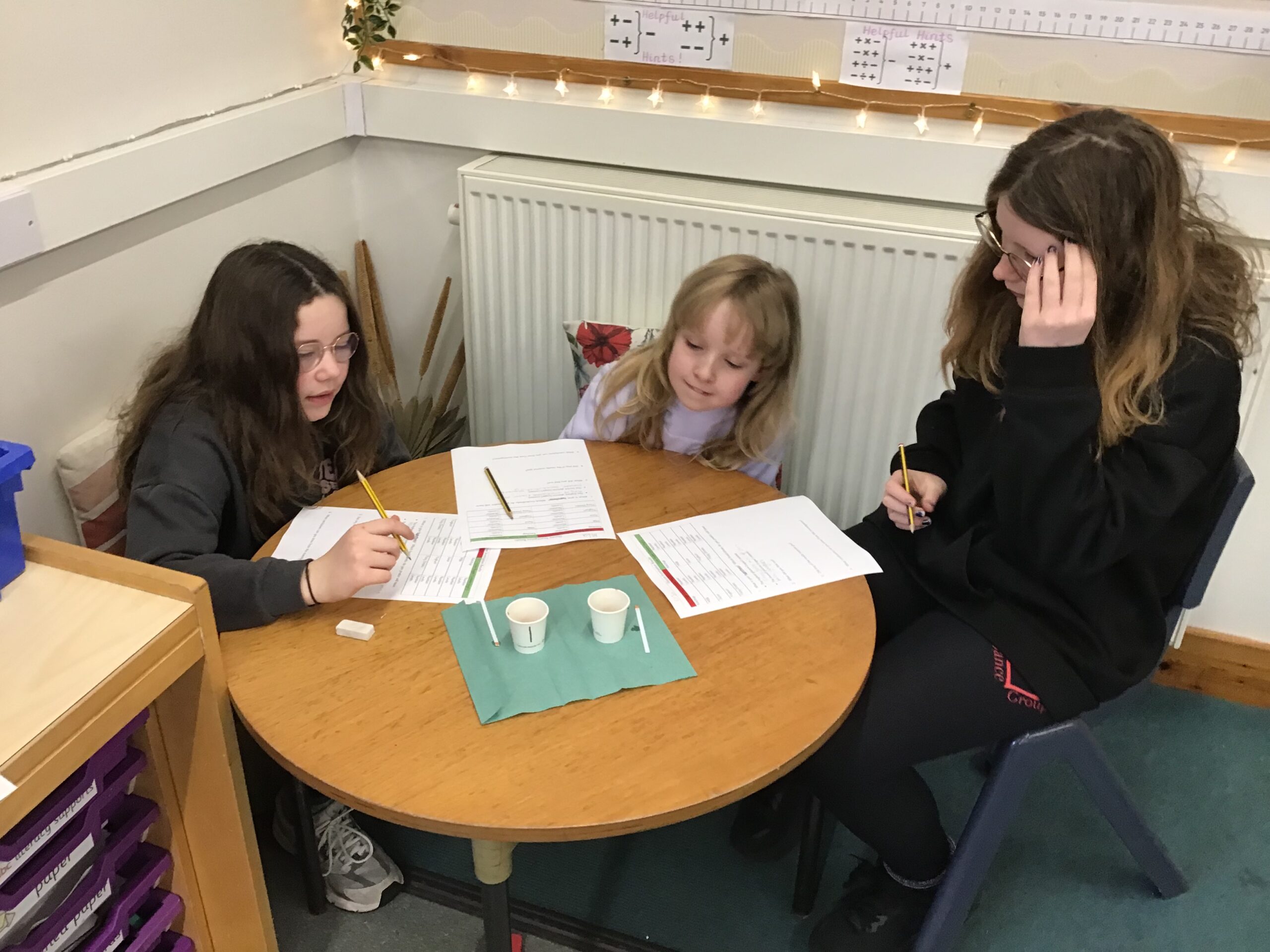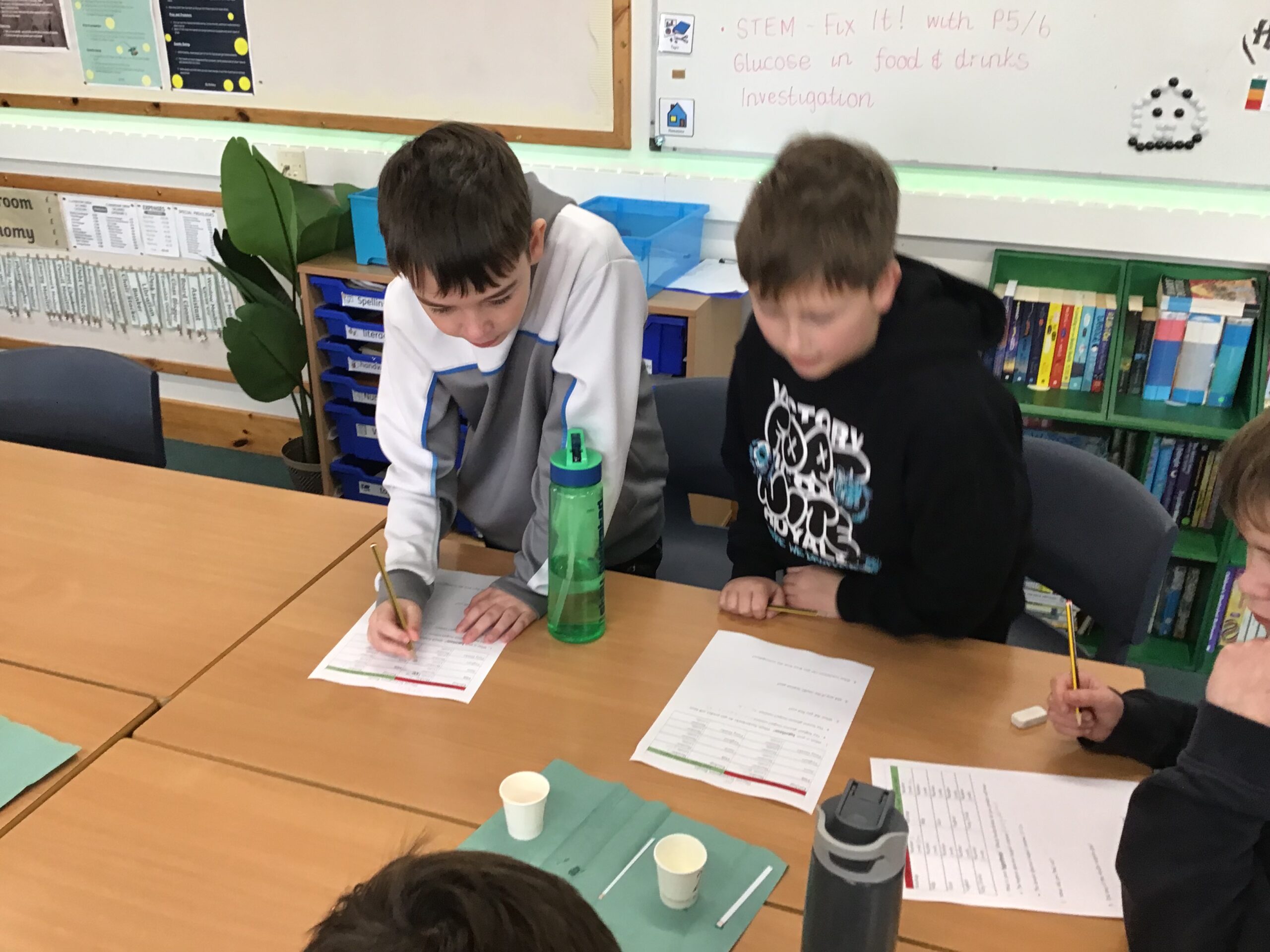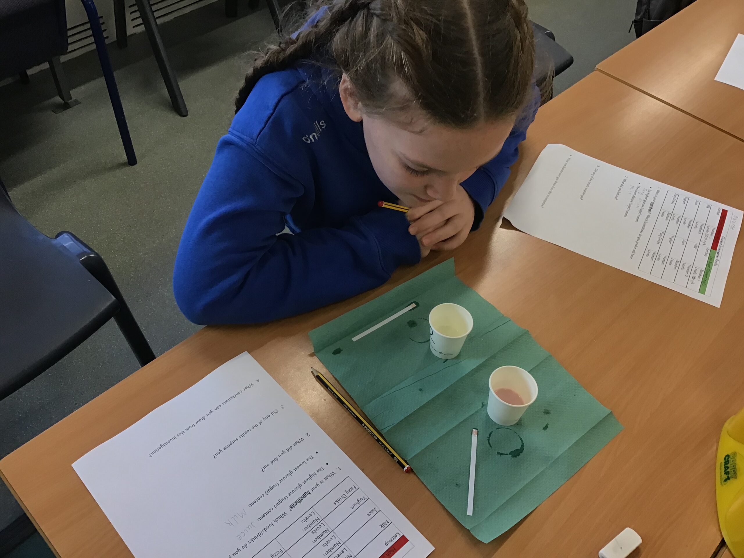 We did an experiment with glucose test strips to see how many mg/l are in different types of food. We had two different types of the same food but one was “low sugar” and one was “high sugar” separated in two pots (we did not know which was which). Then we dipped in the test strips and had to find out which one had more sugar. There was a colour chart and we had to figure out approximately how much sugar was in it.