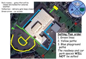 The winter months are always a challenge in our playgrounds and car park areas. The school has a salting plan that the janitor will follow each day. The Adverse Weather Plan Nov 24 graphic shows you the order that the janitor will salt specific areas of the school. These salted paths are created to keep everyone safe and we ask that you stick to them for your and your child’s safety.
