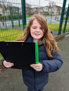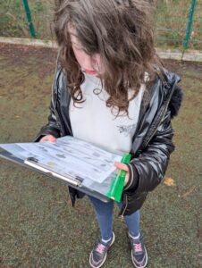 During daily mile in the MUGA, we have been working on using our senses to make connections. We used our senses- see and feel to spot different things. We felt the wind and saw the trees.