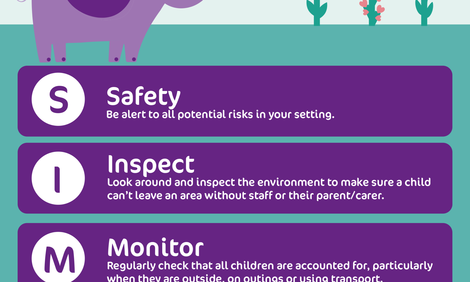 At the Early Learning Unit, we follow SIMOA guidance from the Care Inspectorate to help keep children safe. You’ll notice a purple elephant symbol at our exit buttons, this is a gentle reminder of our safety practices.
