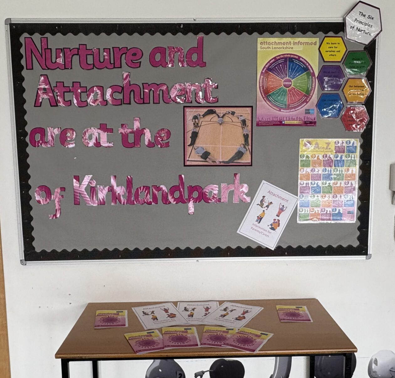 We have created a space in the staffroom for information to be displayed including SLC Attachment Strategy document, A-Z of Attachment Informed Trauma Sensitive Practices, PPRUDB, Attachment Sway and meeting minutes. We also have a lending library with books, activities and resources related to Nurture and Attachment. These can be accessed by all staff including support staff and visiting specialists e.g. SST, to use as they see fit.