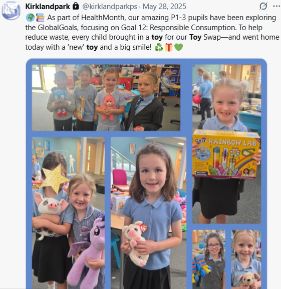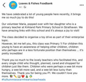 - Working with Climate Action Strathaven to support the Community Fridge project reflected our commitment to compassion, sustainability and social responsibility. By supporting local food banks and redistributing surplus food, we help reduce waste while providing practical assistance to members of our community. This initiative not only addresses environmental awareness but also encourages pupils to understand the importance of fairness and collective responsibility. Through involvement in projects like this, children learn that small, thoughtful actions can make a meaningful difference to both people and the planet.