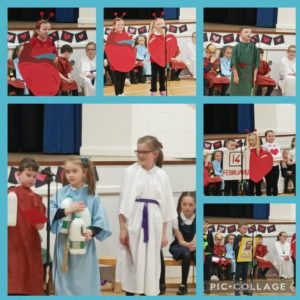 Our assembly was about St Valentine. St Valentine was a Roman priest and doctor who  married people in secret because the emperor did not allow soldiers to get married. We sang the songs ‘Love’ by Michael Ball and ‘I Want to Know What Love is’ by Foreigner.