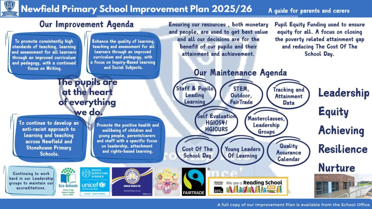 School Improvement Plan To view our current School Improvement Plan, please click here. A full copy of this document is available from the school office. To view our Standards and Quality Report (Newfield Celebrates) for 24/25 click here.