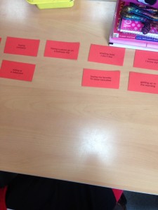 We then thought about some of the different feelings we can have in different situations- things that we feel comfortable with are about a 1 or 2, but things that make us feel uncomfortable or nervous are a 3 or 4. When we are most anxious or worried we are at a 5. Here we are sorting some of the scenarios based on how they make us feel: