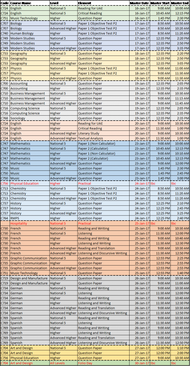 The Balfron HS Senior Phase Preliminary Exams are scheduled for the fortnight of 16th – 27th January 2017. All candidates have been reissued with a personalised timetable, along with a copy of the information below. It would be very useful if you could familiarise yourself with the dates and times of the exams which your child will be sitting. All candidates must sit in the exam desk number allocated. Attendance registers will be taken on this basis.