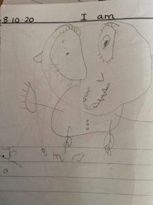 This is a story about feelings and emotions. The colour monster in the book is feeling very mixed up. He is yellow, blue, red etc. (each of the colours represent an emotion e.g. yellow happiness etc.) the story helps the children to identify feelings and understand that we all experience different feelings and sometimes more than one at the same time. This linked to our weekly health and wellbeing activity. We drew our own colour monsters using a guided drawing technique.