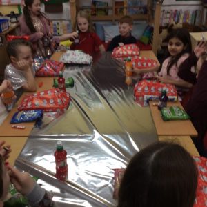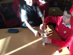 Primary 3 have been working with Mrs Smith on designing and constructing models while cooperating in a group. This is part of our Technology and will eventually link to our next class topic. The children had the challenge to build a tower from the materials provided – marshmallows and spaghetti, which you will see from our photographs. Our challenge worked to an extent, but unfortunately the spaghetti broke easily! Thankfully each group did manage to build something. This week the children will try using wooden sticks and marshmallows to see if that makes a difference.