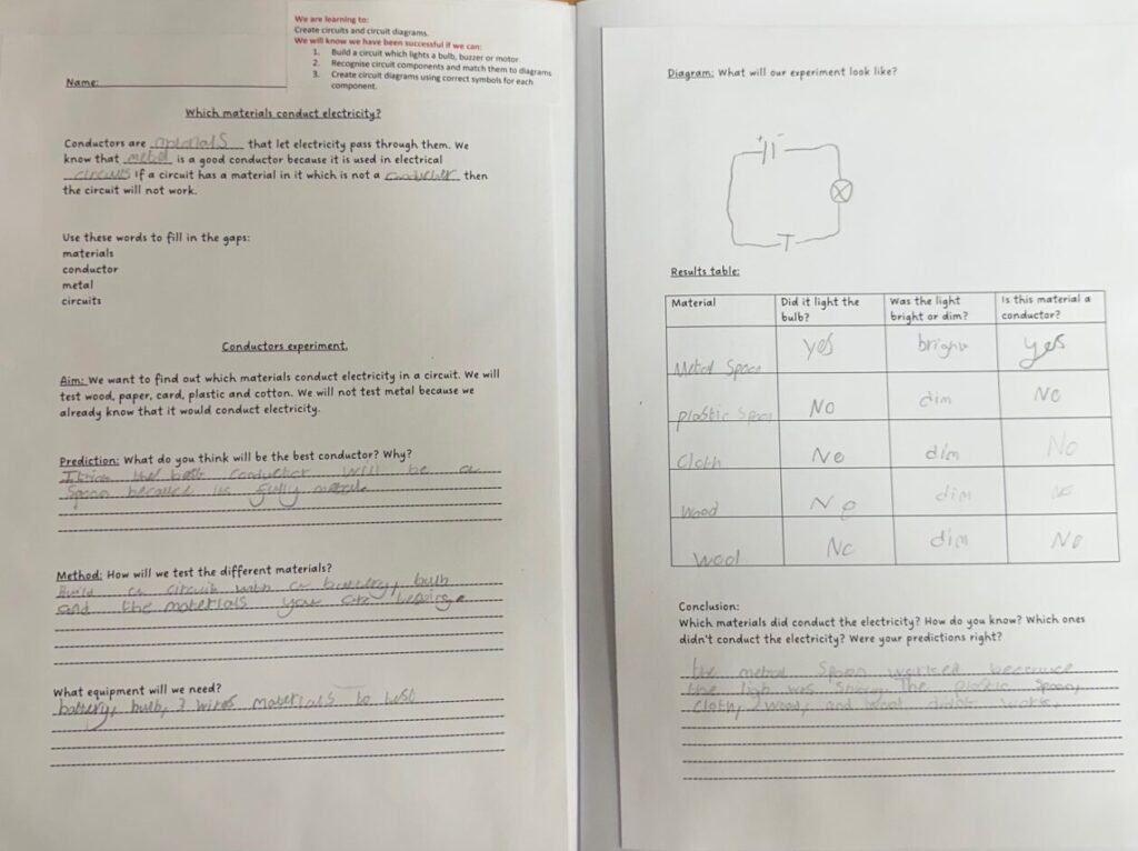 P7/6 were learning about electricity this week and about which materials are conductors and which are insulators. We made predictions and then planned an experiment to test different materials within a circuit to check if the were conductors of electricity or not. We checked this by including them in a circuit with a bulb to check of the bulb would still light. We then wrote up our findings and used our knowledge of circuit symbols to draw a diagram.