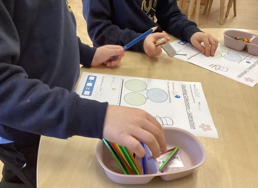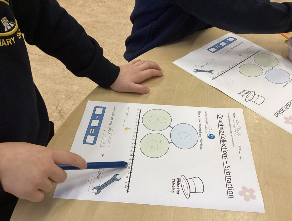 Maths this week has given children lots of opportunities to apply their new skills in subtraction. We have used counting objects, number lines, dice games, online robot-matching games and outdoor experiences. P2 children are learning to use number lines and 100 squares to solve subtraction challenges up to 100, while P1 children are working on challenges up to 30.