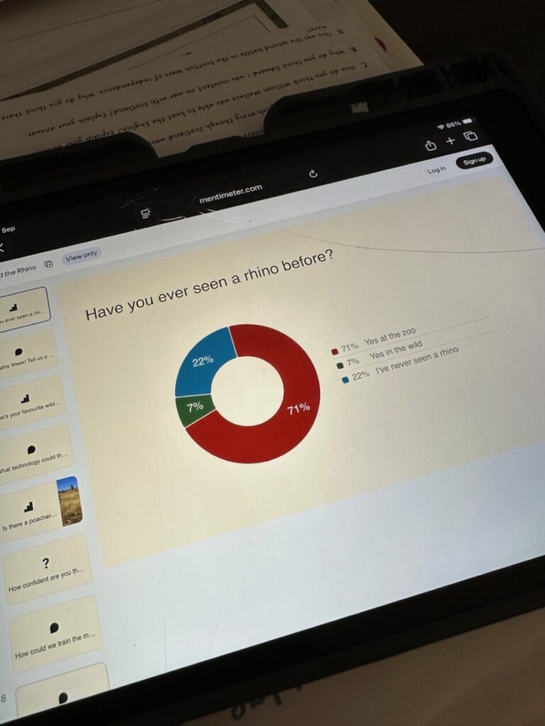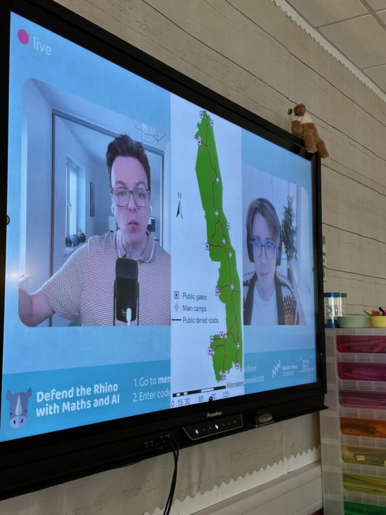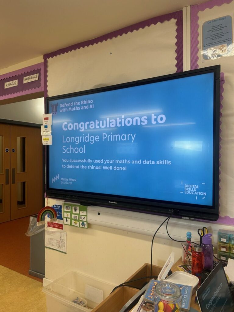 P6/5 and P7/6 have both been taking part in different activities this week to celebrate Maths Week Scotland. This morning we both took part in an online lesson from Digital Skills Education called ‘Save the Rhino’. We learned about how ‘data sets’ and ‘machine learning’ (a form of AI) has been helping Kruger National Park protect Rhinos. We participated via a mentimeter and even got our own personalised certificate at the end as well as a few shout outs of our thoughts and answers during the lesson.
