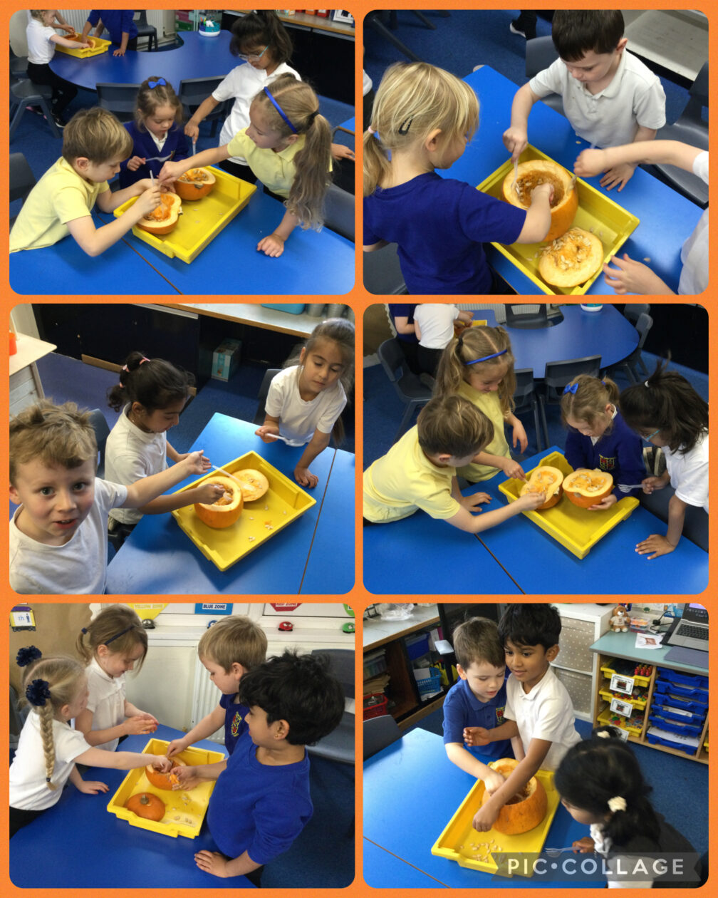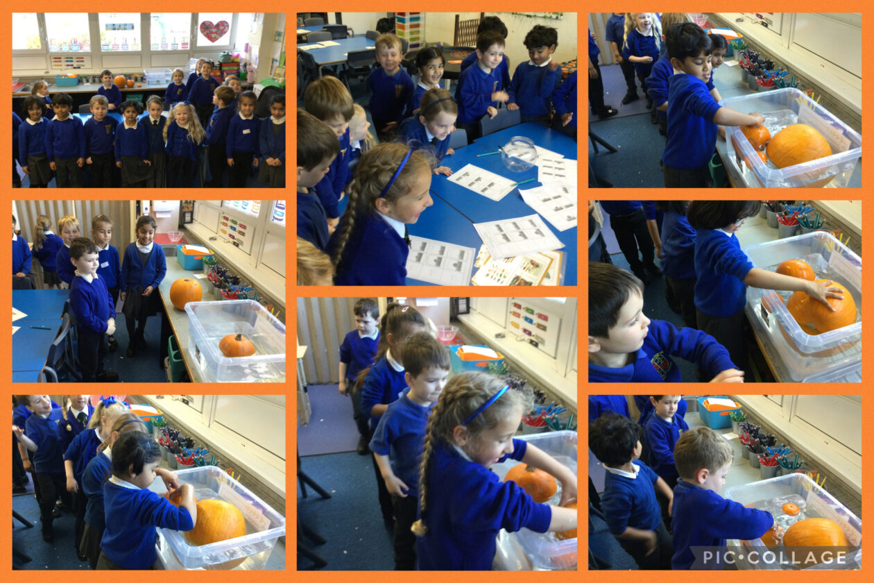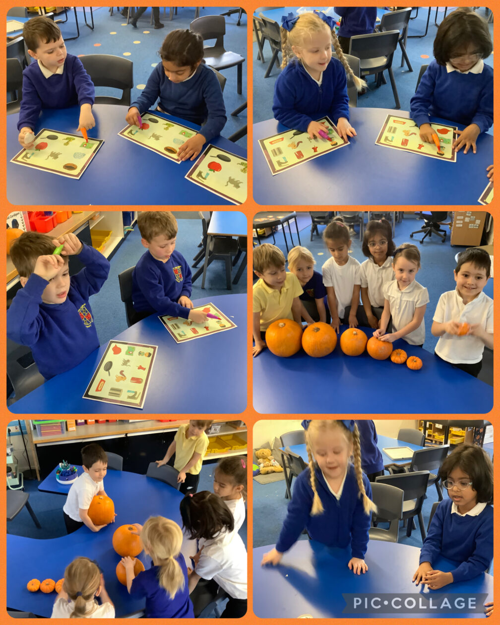 This week we have had a pumpkin themed week! We learned about the parts of a pumpkin and completed a Seesaw task to label the pumpkin correctly. We did a Science experiment to see if the small, medium and large pumpkins float or sink. We had to make a prediction and record the results. We were very excited to take part in this experiment. We also read the story Pumpkin Soup and talked about the characters. We loved cutting open the pumpkins and using our hands, spoons and forks to see what was inside. Lots of people thought the outside of the pumpkin was lovely but the inside was disgusting! We wrote a sentence to describe the pumpkins and used our new common word ‘is’. We also used the whiteboard pens to decorate the pumpkins.