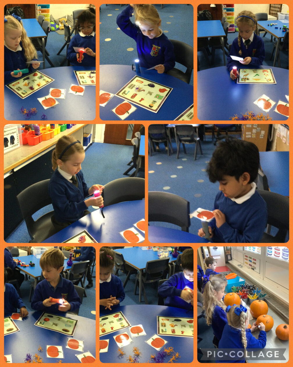 In Literacy, we have been learning the sound ‘i’. We had a reading task where we used torches to find the word behind the pumpkin picture and then we put a spider on the correct picture on our sheet. It was great fun!