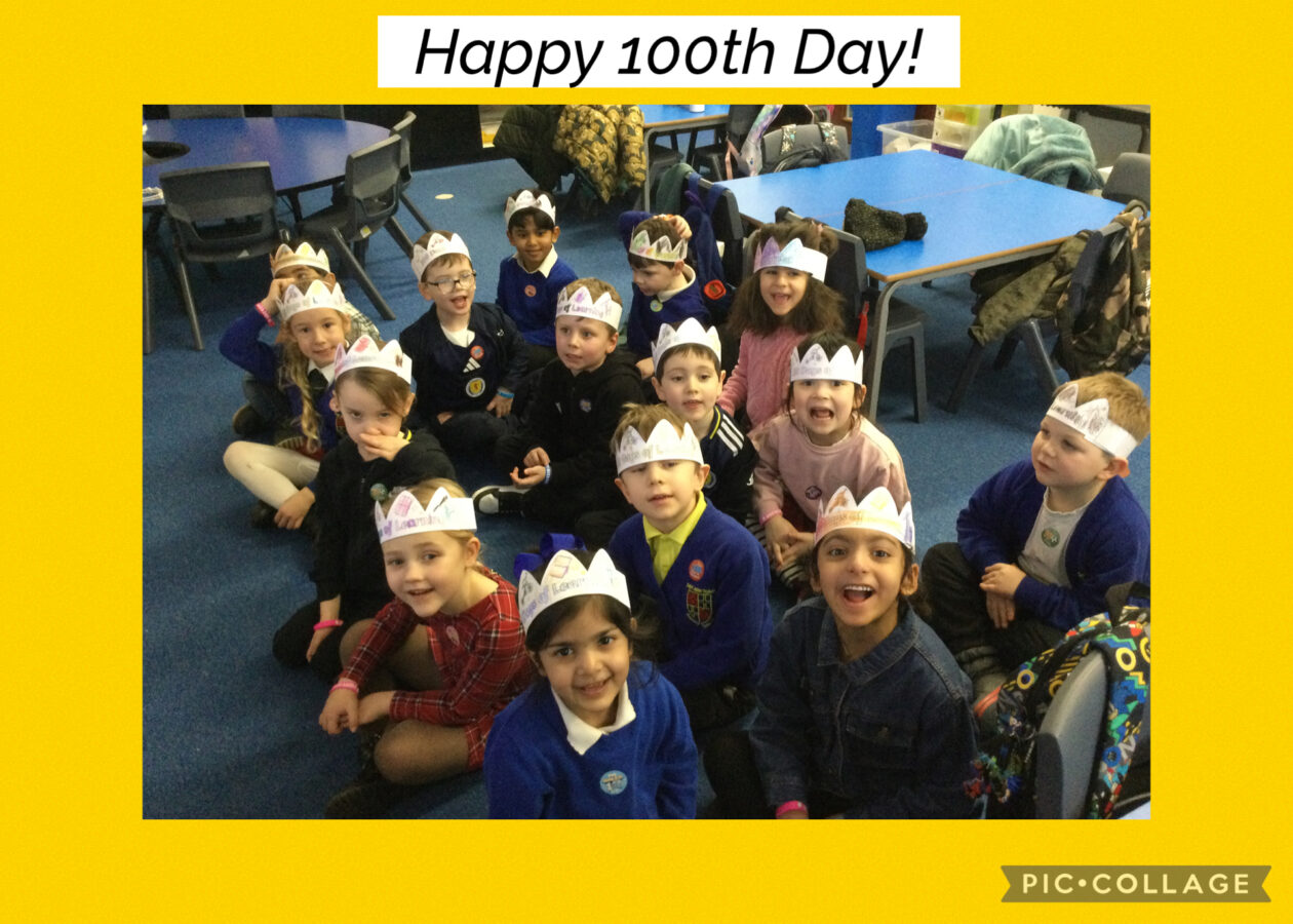 On Friday, we celebrated 100 days of Primary 1. We took part in a challenge to be creative to make things with 100 objects, made crowns, took part in a 100 hunt outdoors with our Buddies and got to make a 100 snack take home to share with our families. We all agreed that this was the highlight of our week!
