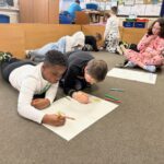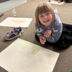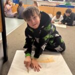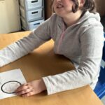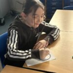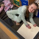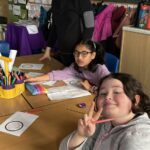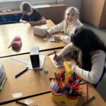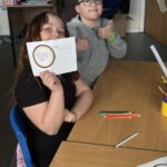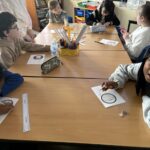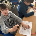 As part of our work to retain our green flag, we had an eco hour last week where we couldn’t use any electricity or technology for an hour.  We actually enjoyed those big lights being off! We designed logos for our uniform swap shop during this time.