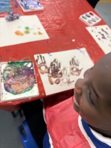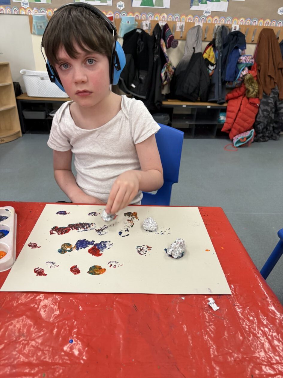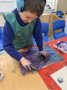 Some process art involved printing with foil and mixing paint colours. This led to some messy, sensory hand mixing and printing by some of the children.
