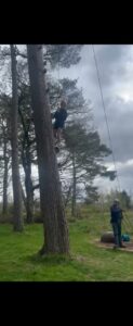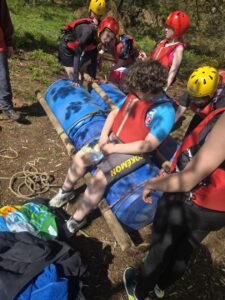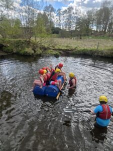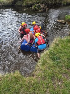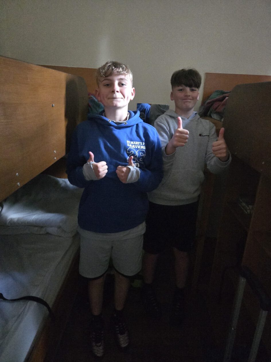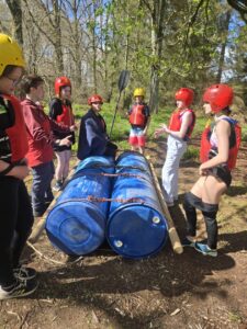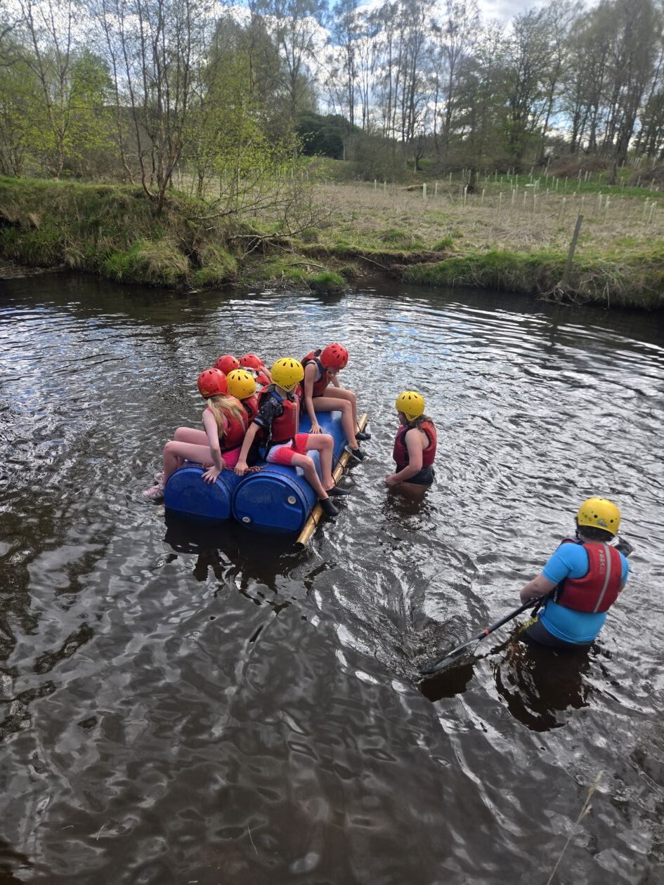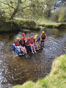 Good evening from a sunny and busy Broomlee Outdoor Centre. What a busy start to our P7 Camp. After an uneventful bus journey, we were welcomed by Dylan, our Supervising Tutor. Fire regulation talks then room organising (special mention to Michael and JJ who made their beds very quickly) was followed by our 1st Group Activity. Group 1 were raft building and group 2 were high in the trees doing the Cat Walk. Lots of challenges and working together but we were resilient and helped each other succeed. The Raft Group 1 built was christened ‘The SS Mary’. She didn’t sink- this time!