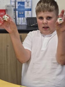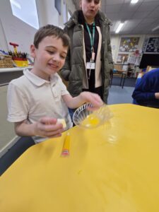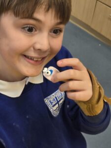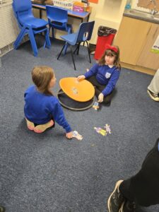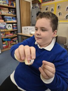 In number, we have been learning about Fractions. We used a big bag of sweets to help our understanding about what a fraction is. Everyone helped share out our 1 Big Bag into tenths. Some of us even understood sharing the small bags into thirteenths. Mr Elliott, Mrs Mains and Mrs Hill were absolutely amazed at our knowledge.