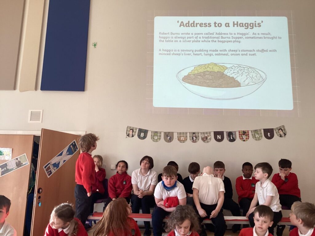 On Friday, our classes came together to celebrate Burns Day with a fantastic assembly filled with Scottish culture, music and tradition. It was a wonderful tribute to Robert Burns and showcased the talents of our pupils. Both classes performed Scottish songs such as ‘The Jeely Piece Song’ and ‘Coulter’s Candy’, we heard various Burns poems read aloud which brought his famous words to life and we discussed the life of Robert Burns and the traditions of Burns Night, including the famous Burns Supper, complete with haggis, neeps and tatties!
