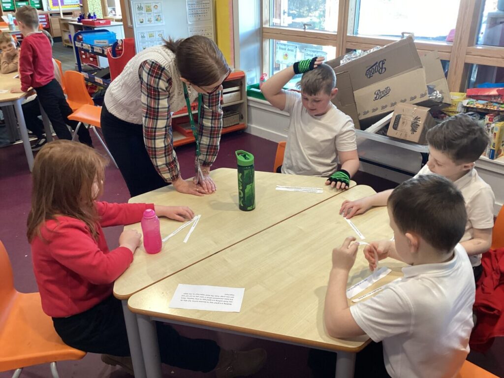 Today as part of Maths week Scotland, we worked outside as a team to collect natural materials such as leaves, pebbles, sticks and feathers. Back in the classroom we created designs such as repeated patterns and lines of symmetry using our own materials.